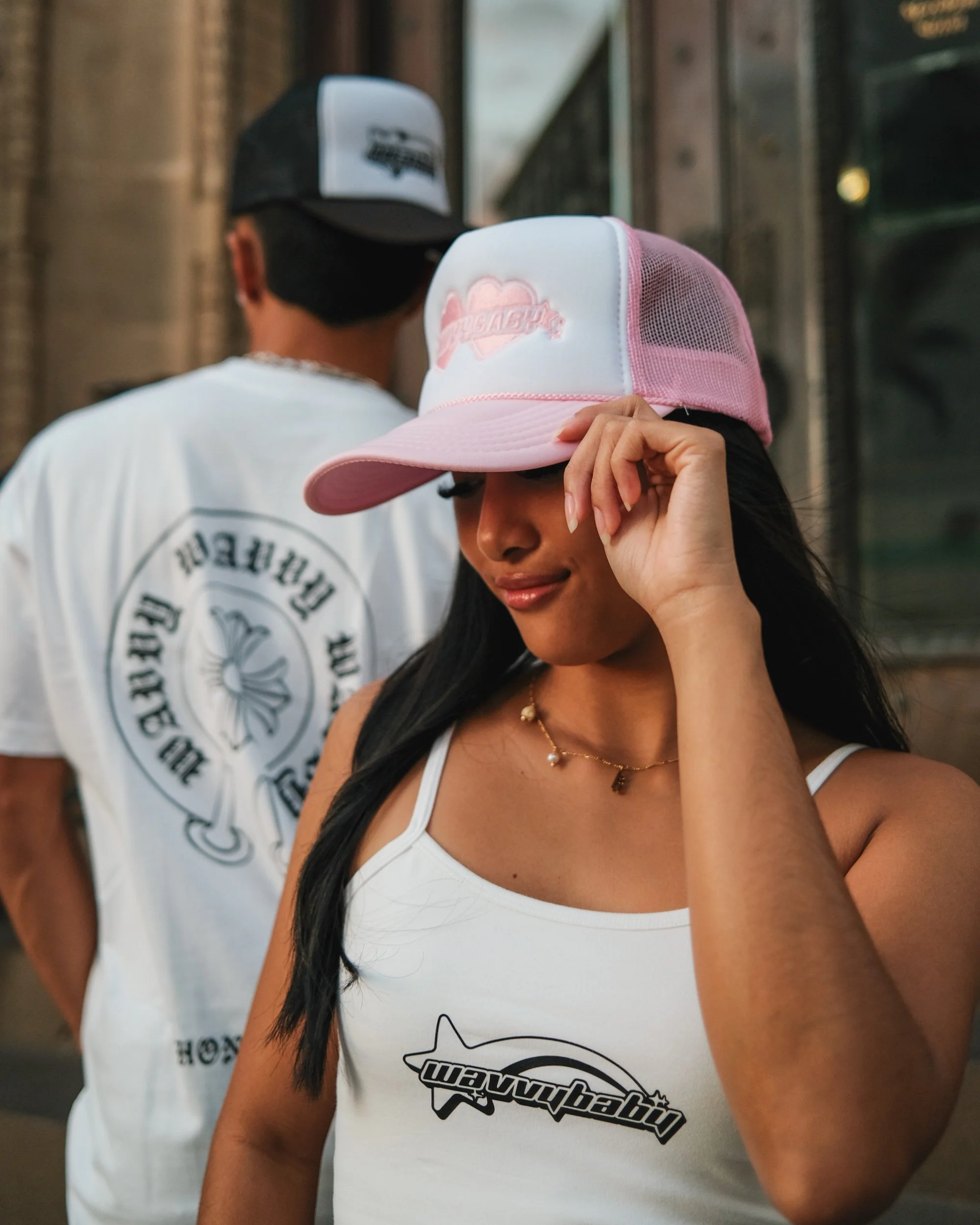 A pink-toned trucker with a white front panel, featuring our double-heart WavvyBaby design. Lightweight, breathable, and perfect for any vibe.